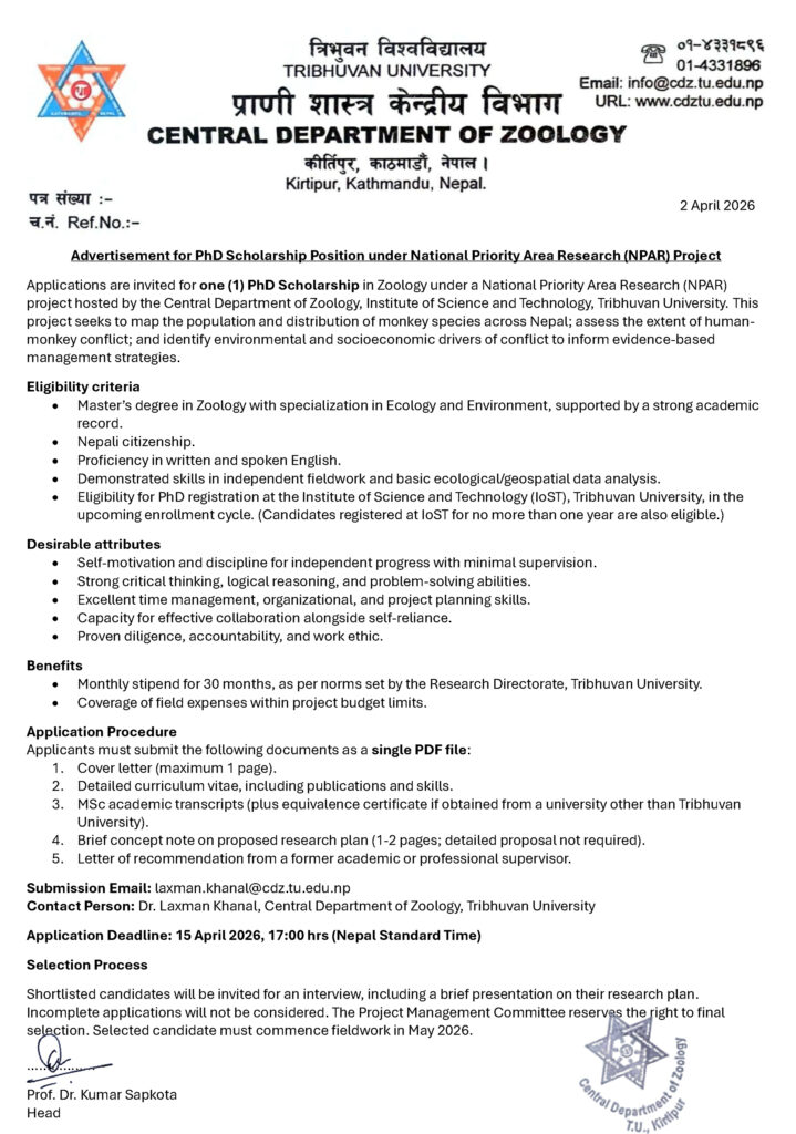 Applications are invited for one (1) PhD Scholarship in Zoology under a National Priority Area Research (NPAR) project hosted by the Central Department of Zoology, Institute of Science and Technology, Tribhuvan University. This project seeks to map the population and distribution of monkey species across Nepal; assess the extent of human-monkey conflict; and identify environmental and socioeconomic drivers of conflict to inform evidence-based management strategies.